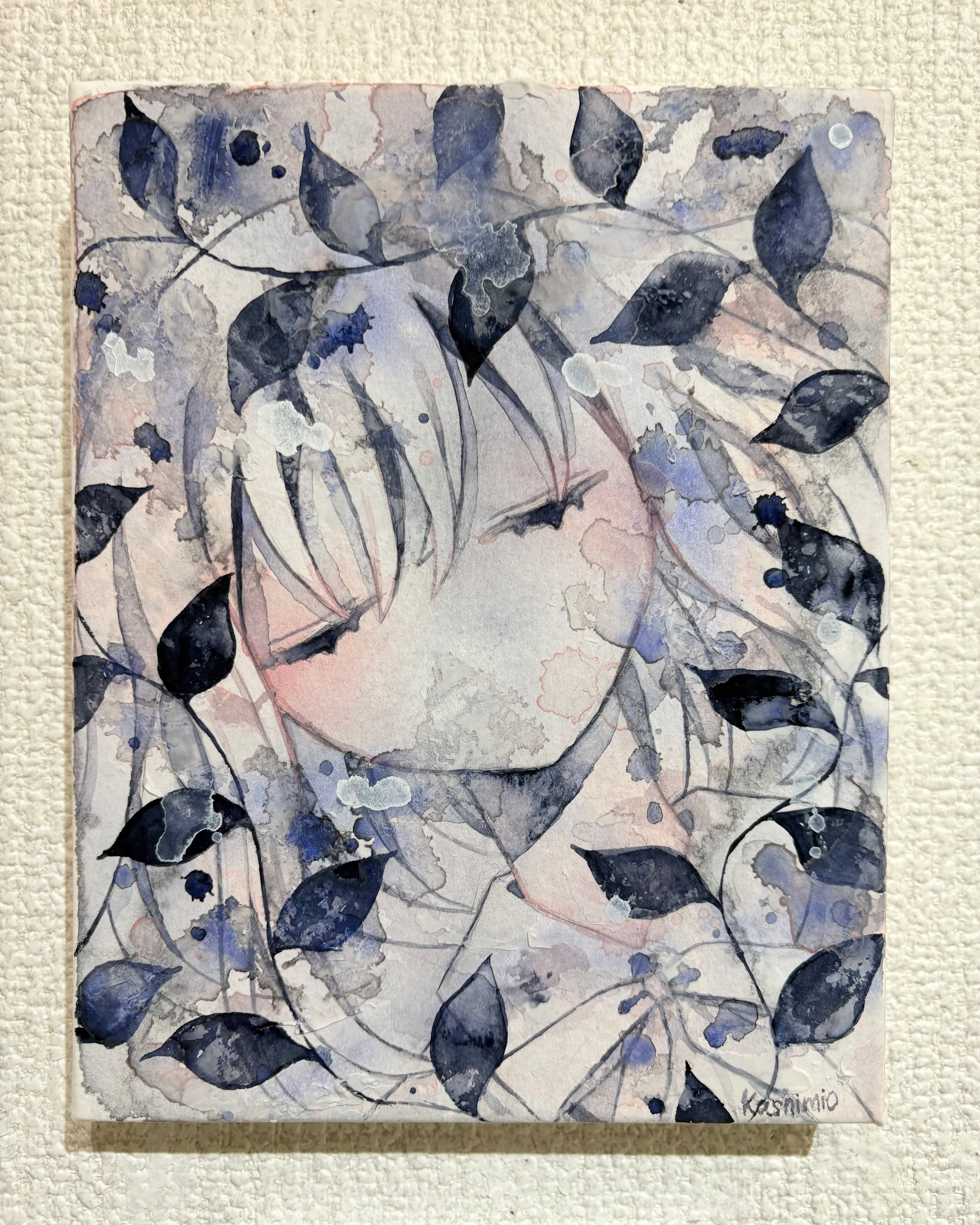 透明水彩とモデリングペーストを用い、不穏な空気を纏う少女や抽象画を描いています。